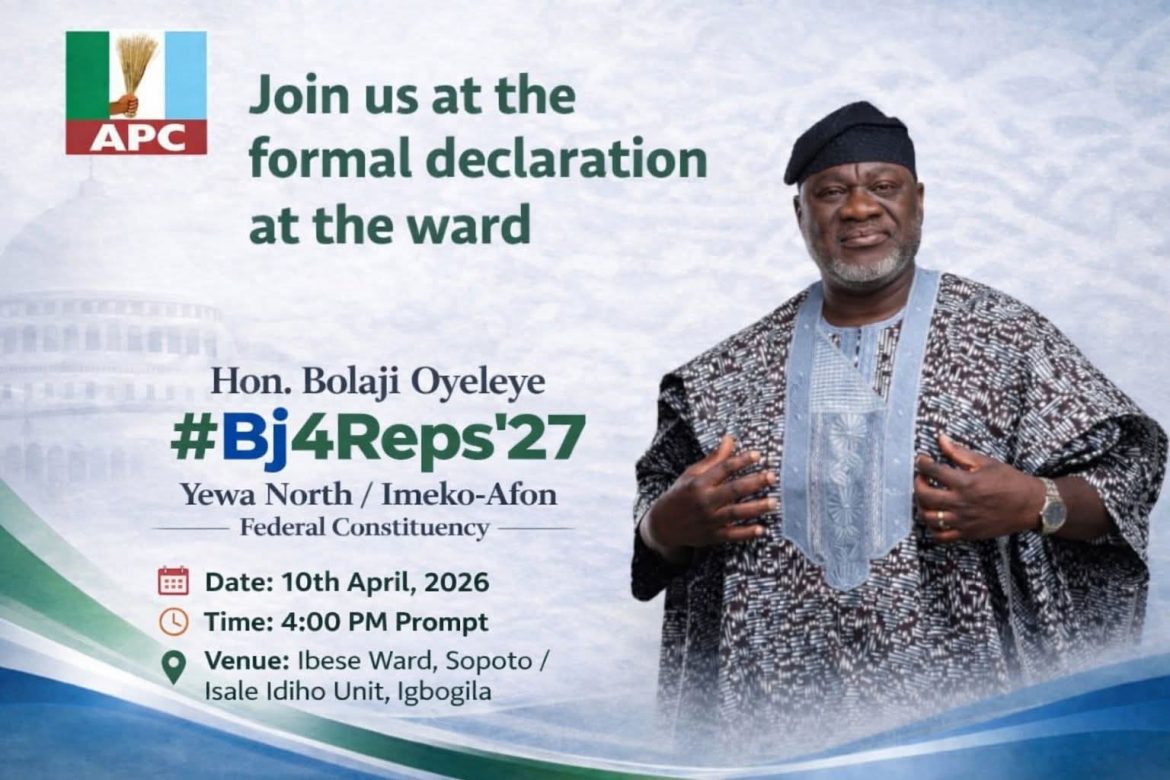 Hon. Bolaji Oyeleye has announced plans to formally declare his intention to contest for the House of Representatives seat representing Yewa North/Imeko-Afon Federal Constituency in the 2027 general elections.