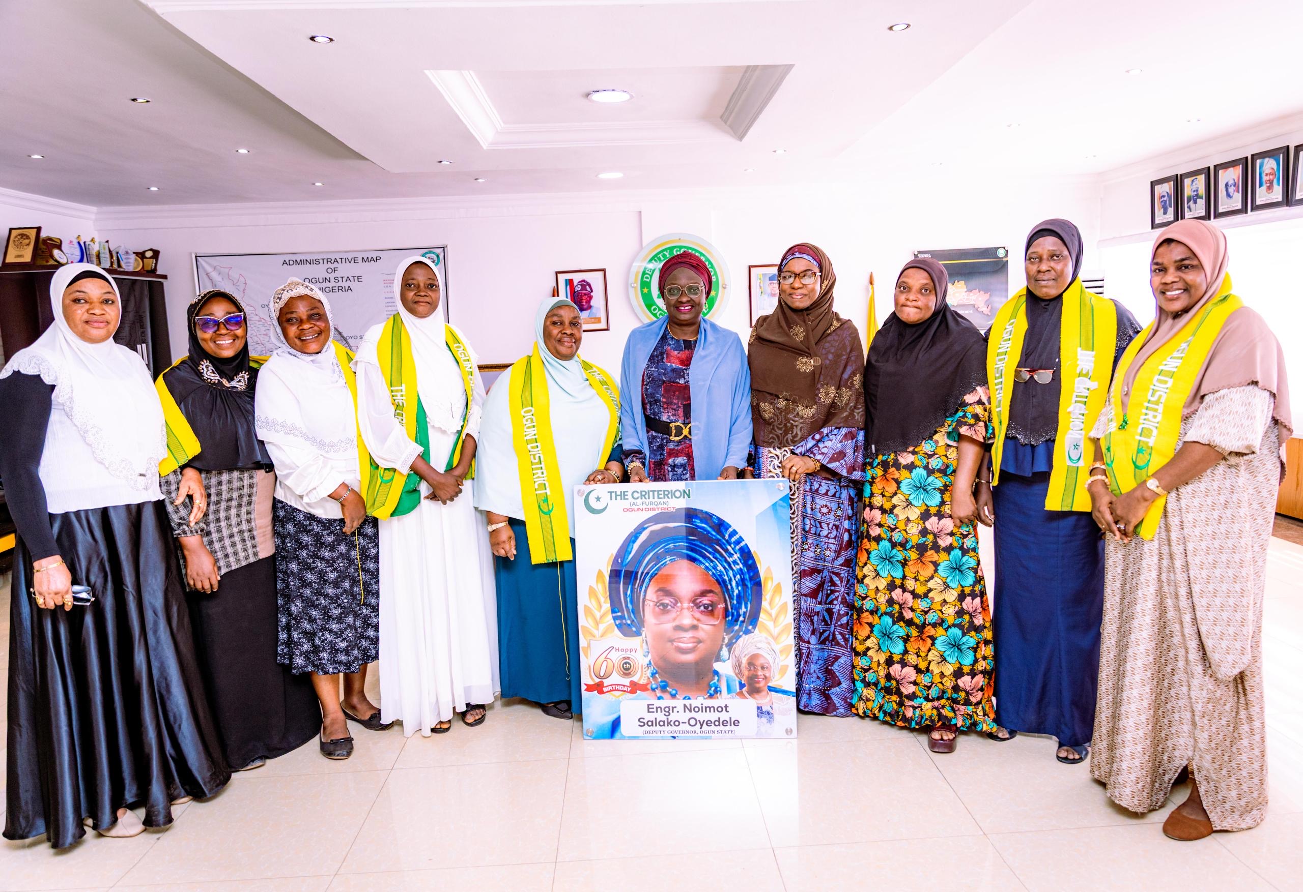 The atmosphere in Abeokuta was filled with grace and sisterhood today as a high-powered delegation from The Criterion (Association of Muslim Women in Business and Professions), Ogun District, celebrated a true icon. Led by District Amirah, Hajia Engr. Qudrat Oluwakemi Ayinde Oladimeji, the group paid a heartfelt visit to the Deputy Governor of Ogun State, Her Excellency, Engr. (Mrs.) Noimot Salako-Oyedele, to mark her milestone 60th birthday.