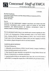 In another twist, a group identifying itself as Concerned Staff of FMC Abeokuta petitioned the Independent Corrupt Practices Commission (ICPC) in October 2025, accusing Dr. Isreal of abuse of office and mismanagement. The petition alleged that he unilaterally restructured FMCA Consult Limited, made himself a majority shareholder, appointed political associates as managers, and sidelined civil servants in violation of financial regulations and ethical standards.
