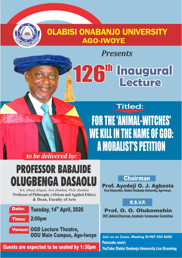 The lecture, titled “For the ‘Animal-Witches’ We Kill in the Name of God: A Moralist’s Petition,” will hold on Tuesday, April 14, 2026, at the OGD Lecture Theatre, OOU Main Campus, Ago-Iwoye. It is expected to draw scholars, students, and members of the public interested in ethical discourse and contemporary religious issues.